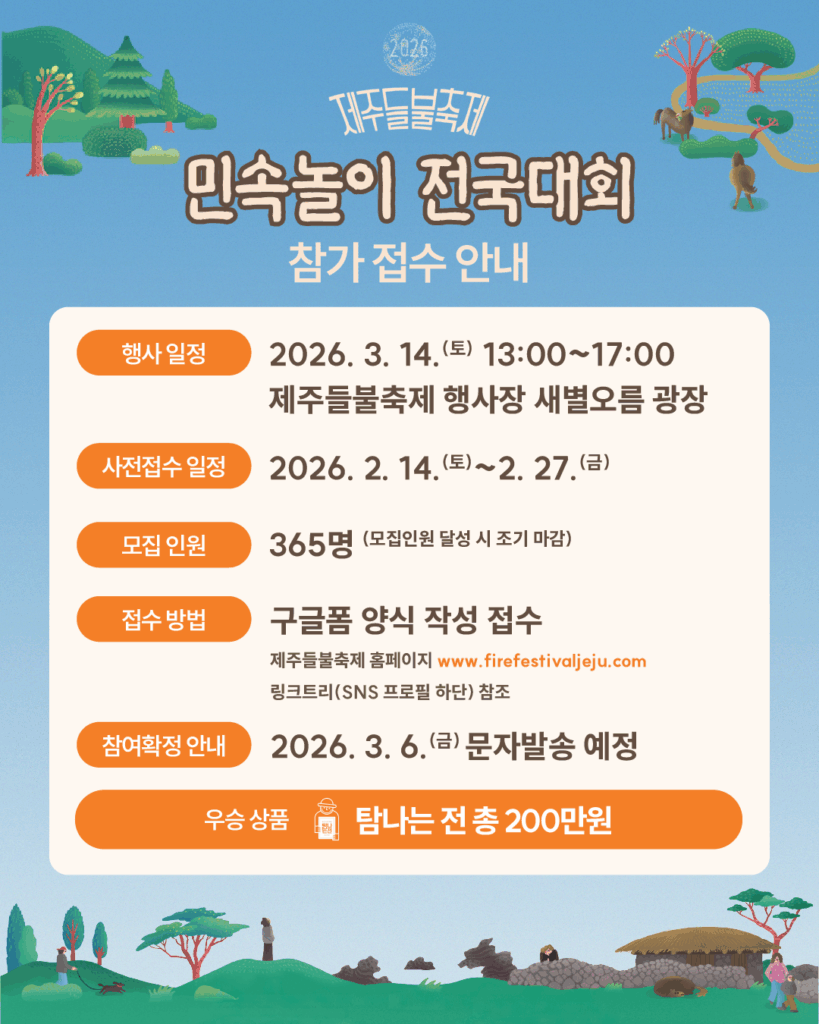 → 제주들불축제 홈페이지 www.firefestivaljeju.com - 참여 확정 안내 : 2026. 3. 6.(금) 문자 발송 예정
